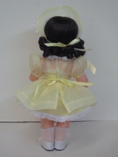 Yellow organdy/white sheer dotted Swiss bib, matching satin ribbon sash, matching slip,