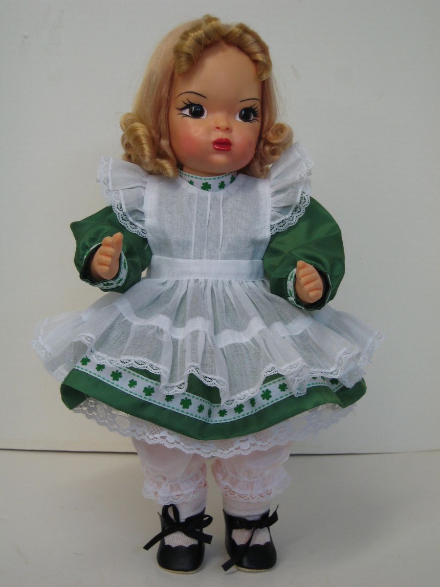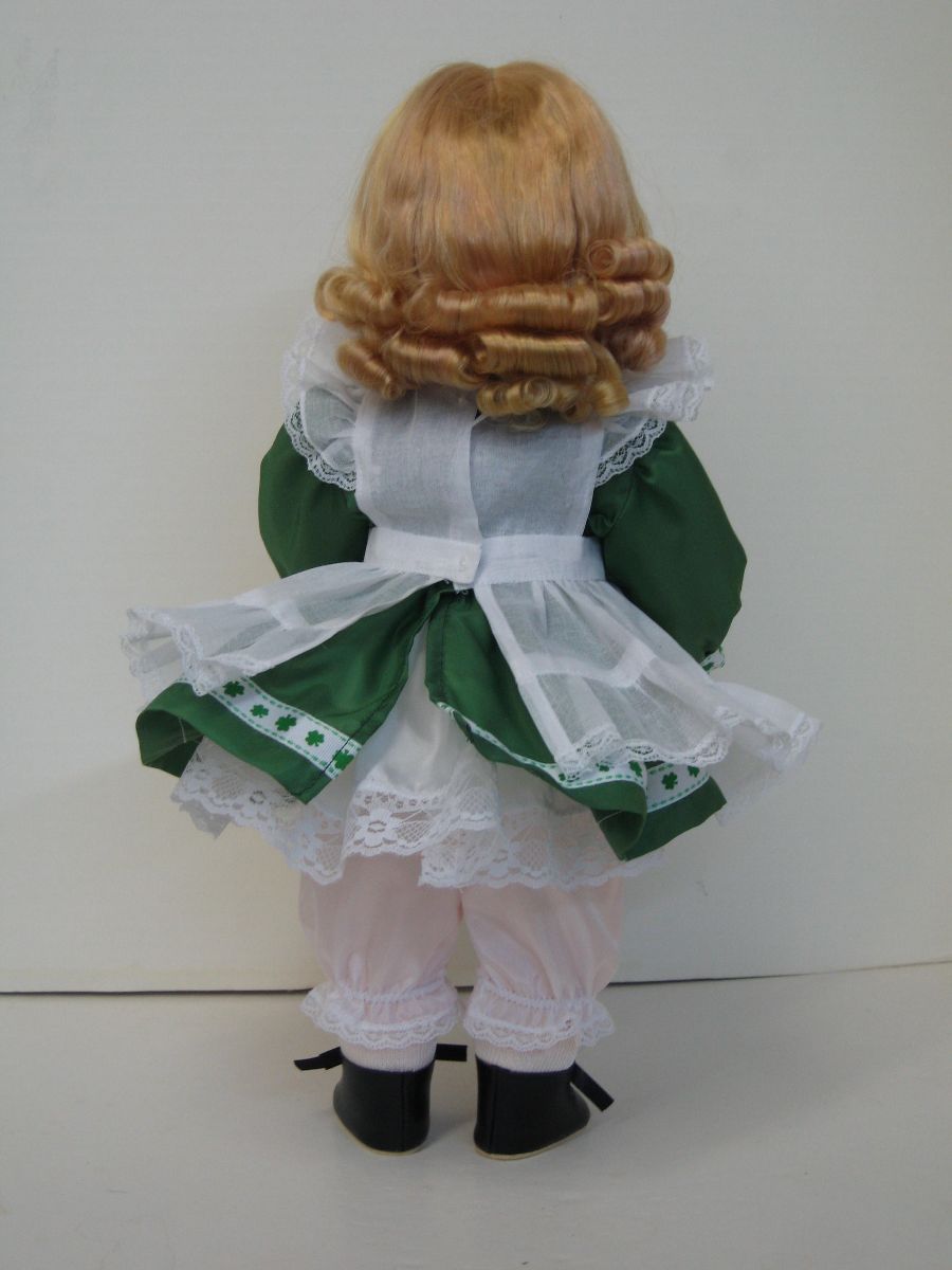 Copied from the original. Green taffeta under dress with long sleeves and trimmed shamrock ribbon, organdy pin-tucked pinafore trimmed in lace. Comes with slip and pantaloons. $40 |