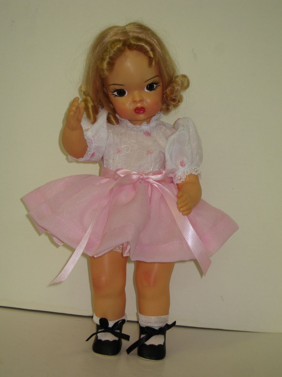 Sheer white bodice trimmed with pink embroidery, lined with pink taffeta, attached taffeta slip, matching rumbas and matching batiste skirt. Copy of original. $35