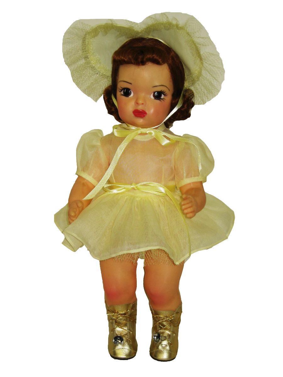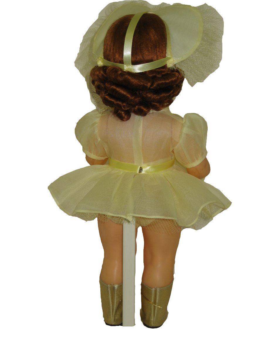 Yellow voile short dress, two layers of underskirt netting. Voile panties and matching hat trimmed with net. $30 |