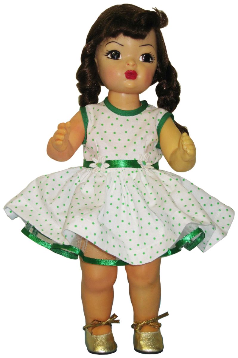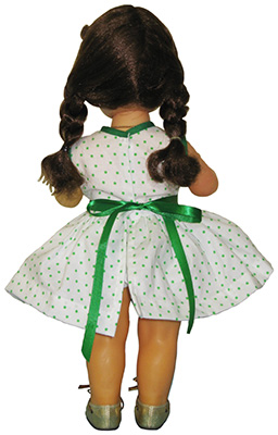 White/ green coin dot print, trimmed with daisies and green satin ribbon, has 3 attached canan and mathching coin dot rumbas/ mathching ribbon $30 |